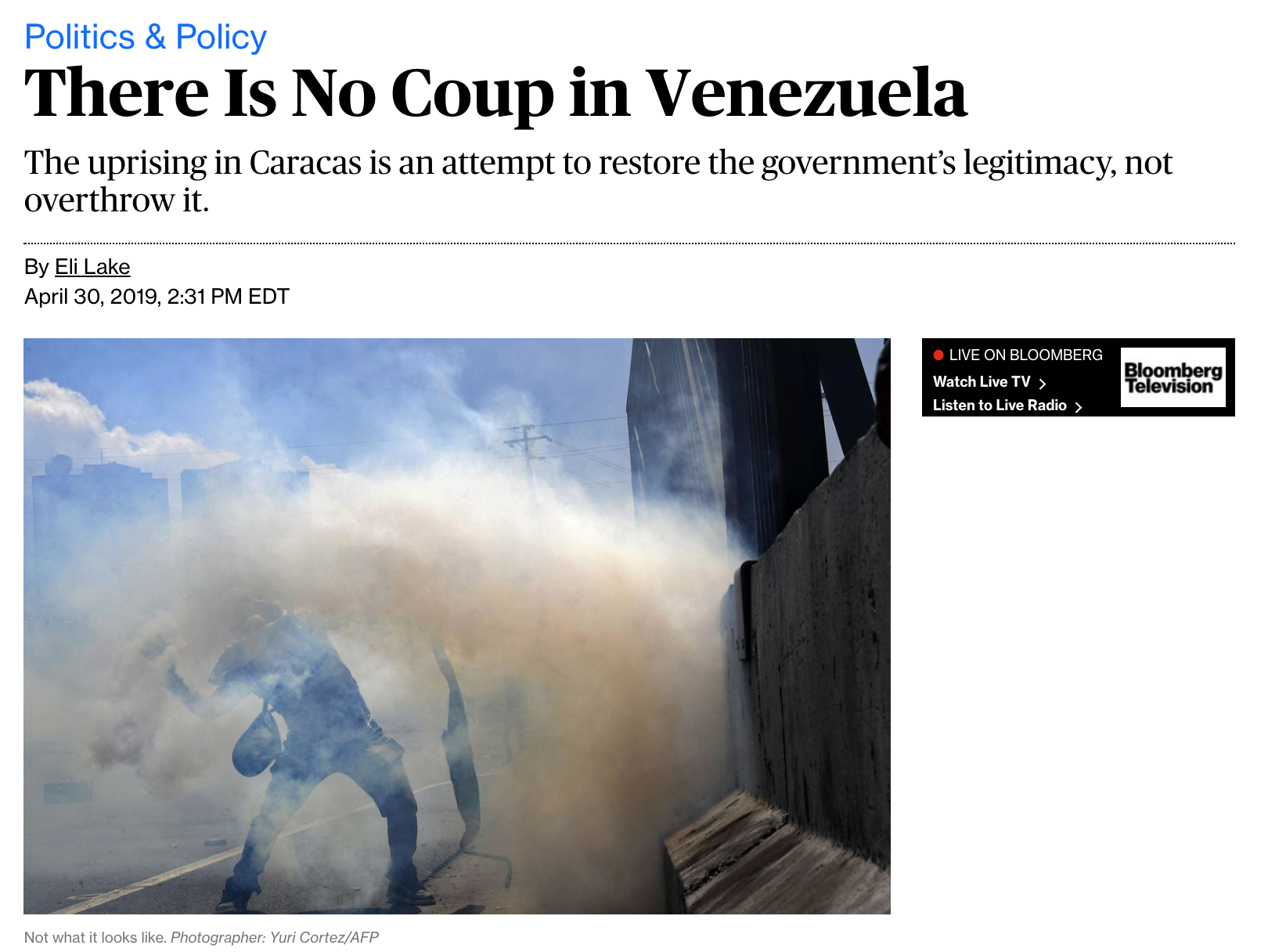 It “can’t be called a ‘coup,’” wrote Andres Oppenheimer in the Miami Herald (4/30/19)—it’s a “military uprising.” “This is not a coup,” declared Eli Lake for Bloomberg (4/30/19)—but a “democratic rescue mission.” But the award for most awkward euphemism goes to the Washington Post (4/30/19), which offered “opposition-led, military-backed challenge.” Anything to avoid that four-letter word.