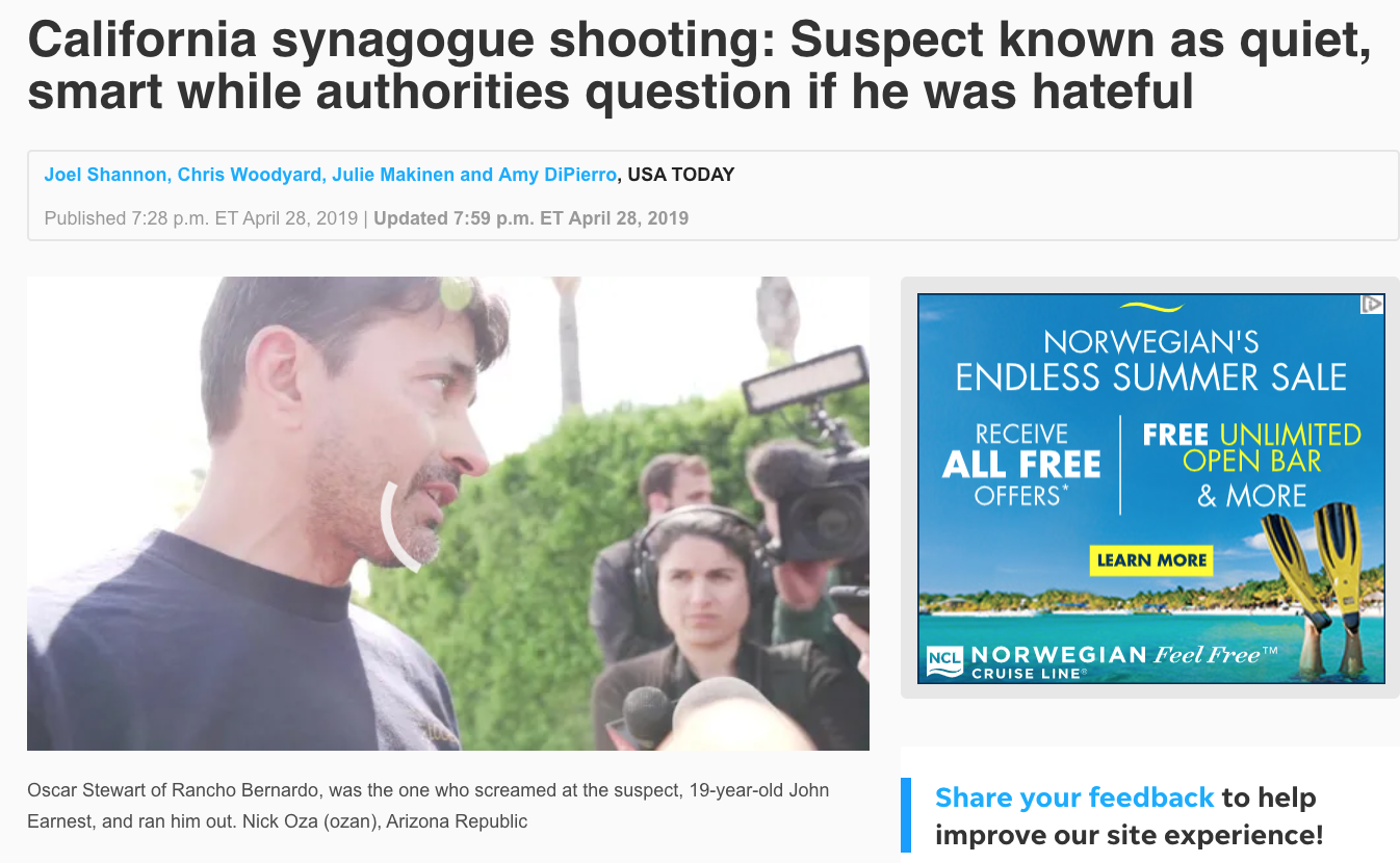 Similarly, USA Today‘s headline (4/28/19) read, “California Synagogue Shooting: Suspect Known as Quiet, Smart While Authorities Question if He Was Hateful.”