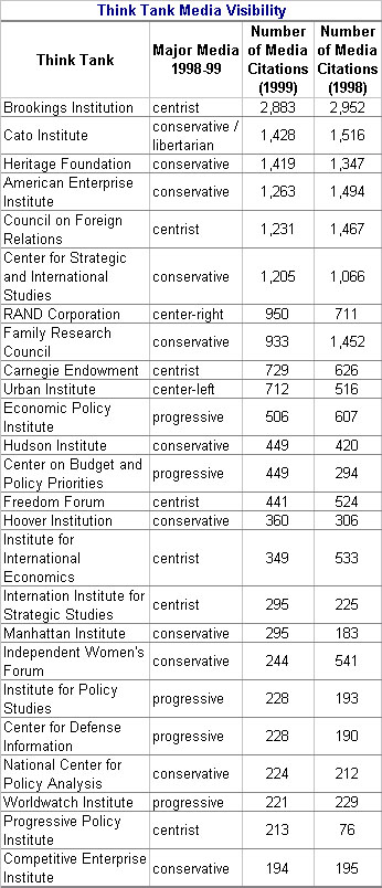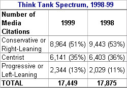 While this survey reveals that media show a greater reliance on think tanks than at the time of the last survey two years ago, the constituencies representing a center/right debate have further cemented their positions as media-friendly analysts. In the survey of 1997, conservative or right-leaning think tanks received 53 percent of all citations, 32 percent of citations went to centrist think tanks, and only 16 percent of the citations went to progressive or left-leaning think tanks. The percentages for progressive or left-leaning think tanks have declined slightly since then.