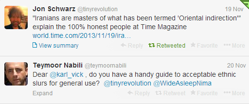 Now that’s not as offensive as, say, Richard Cohen’s “These Persians lie like a rug,” but it’s closer to the similarly bigoted notion that Iranians have special religious license to lie. Vick seems to wish Iran were more direct; sure, and I wish all political leaders everywhere were.